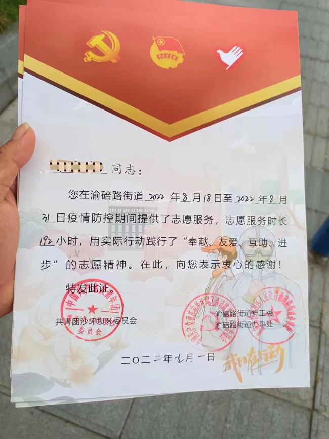 考神員工於2022年8月參與楊公橋社區誌願服務,服務時長192小時,街道為每位員工頒發誌願服務證書,以此鼓勵!